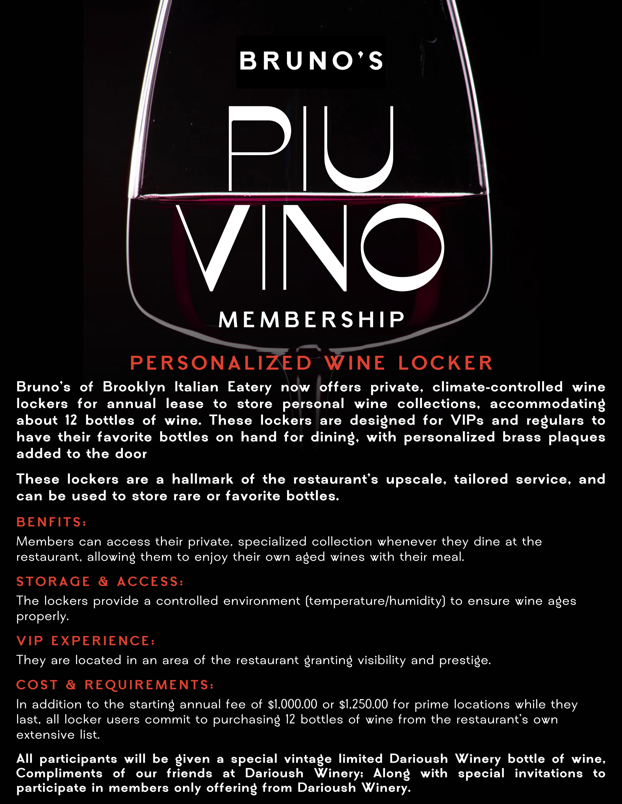 Annual lease rates for prime location Wine Lockers start at $1,000. In addition, members commit to purchasing 12 bottles of wine from Bruno’s of Brooklyn’s extensive wine list.